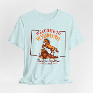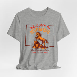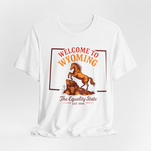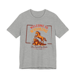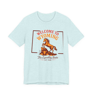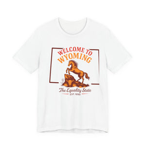 A soft, lightweight crew tee that channels open-range Wyoming vibes. The front screen features a lively rearing horse and retro lettering reading “Welcome to Wyoming — The Equality State,” giving the shirt a warm, slightly vintage look. Breathable Airlume combed cotton feels cool against the skin and layers easily under jackets or flannels. Subtle construction details — side seams, ribbed collar, shoulder tape and a tear-away label — keep the shirt sitting neatly day after day while staying comfortable on long drives, trail days, or casual town strolls. The clean white canvas makes the print pop and keeps the design versatile for everyday wear or travel days when you want a touch of Western nostalgia.